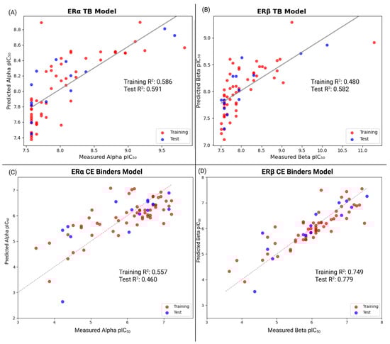 The development of QSAR models with experimental results serves to validate the QSPR results and creates binding affinity predictions. The QSPR modeling predicted the directional effects of molecular descriptors on binding affinity. In order to transition from property relationships to create binding affinity predictions, QSAR models were developed. The QSAR framework was first verified with DUD-E then developed with experimental binders. DUD-E benchmark datasets were used to validate the predictive accuracy of the ChemMaster software and the molecular descriptors used in our QSAR approach. DUD-E is a benchmark virtual screening dataset containing our ER targets (ESR1 and ESR2). Each dataset contains both known active and decoy ligands, which are used to test molecular docking and scoring methods. Descriptors were gathered for both active and decoy ligands using the same procedures outlined in Section 2.5, and the dataset was split randomly into an 80/20 training/testing split. Decoy binding affinities were set to 100,000 nM for standardization as a baseline, as the DUD-E dataset had listed binding affinities of “>100,000 nM” for all decoys. Compounds with KI values listed were converted to IC50, then pIC50. Plots were generated to compare the predicted pIC50 versus experimental pIC50 values (Figure 10). Explicit thresholds were not applied in this analysis.