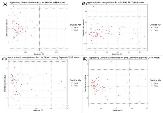 In order to evaluate model reliability and scope, Williams plots were generated for ERα and ERβ using both the TB and CE datasets (Code S11). The plots assessed the prediction error through standardized residuals and structural influence through leverage. Here, an acceptable fit denotes the absolute value of the residual being less than three, while high leverage indicates compounds that lie outside of the model’s structural domain (Equation (2)).