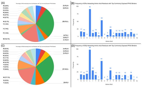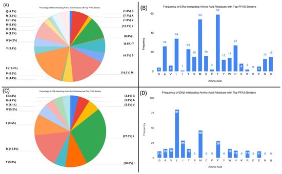 This figure shows the frequency of certain amino acid residues interacting with the top PFAS ligands from the TB models at the orthosteric binding sites of ERα and ERβ. The graphs display the frequency at which each residue interacted with the PFAS ligand within a 5 Å distance. (A) Percentage of each interacting residue with the top PFAS binders at the ERα orthosteric site. (B) Frequency of each interacting residue with the top PFAS binders at the ERα orthosteric site. (C) Percentage of each interacting residue with the top PFAS binders at the ERβ orthosteric site. (D) Frequency of each interacting residue with the top PFAS binders at the ERβ orthosteric site.