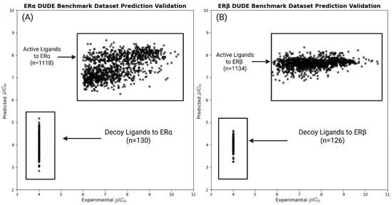 (A) The predicted vs. experimental pIC50 values from QSAR models for ligands binding to ERα. (B) The predicted vs. experimental pIC50 values from QSAR models for ligands binding to ERβ. This figure shows the ability of the QSAR models in differentiating between active and decoy ligands for both ERα and ERβ. Predicted pIC50 values were generated from QSAR models trained on the DUD-E benchmark dataset combining both active and decoy datasets. Each point in the plot represents a ligand, either active (known binders) or decoy (non-binders), with the model demonstrating the ability of the model to accurately differentiate between either set.