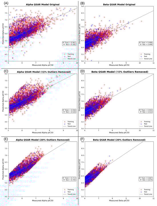 Predicted versus measured pIC50 values from QSAR models trained on two rounds of dataset refinement for ERα and ERβ. (A,B) show the models trained on the full selected dataset of docked PFAS compounds for ERα and ERβ without outlier exclusion. (C,D) represent the first round of refinement, where 10% of the outliers were removed from the full dataset graphs for both ERα and ERβ. (E,F) display the second round of refinement, where 20% of the outliers were removed from the full dataset graphs for ERα and ERβ. Each refinement step resulted in a stronger correlation between predicted and measured pIC50 values, indicating that removing outliers improves model performance and may help reduce the noise in the data. These findings support the importance of refinement in building accurate QSAR models when experimental data may not exist.
