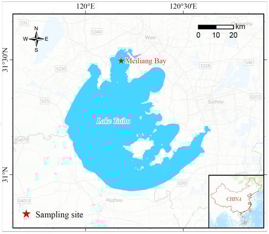 The northern section of Lake Taihu, known as Meiliang Bay (31°30′31.1″ N, 120°10′31.0″ E), covers approximately 123 km2 and has a water depth ranging from 1.8 to 2.3 m (Figure 1). Increasing anthropogenic activities around Lake Taihu have led to the discharge of untreated or insufficiently treated industrial, agricultural, and domestic wastewater into the lake, resulting in the enrichment of nutrients and heavy metals in the sediments [,,].