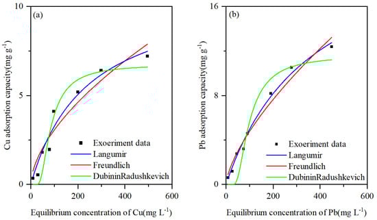 Adsorption isotherms of (a) Cu and (b) Pb from water on CNTs.