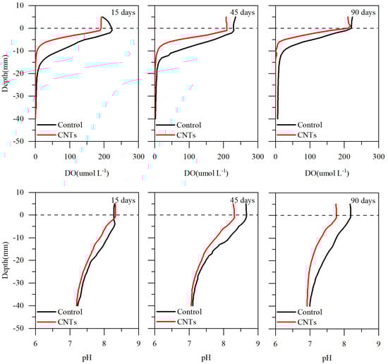 Figure 4 depicts the fluctuations in DO and pH levels in the sediments. On days 15, 45, and 90 after CNTs application, DO levels in the CNTs group remained consistently lower than those in the control group. On days 15, 45, and 90, the DO concentrations in the overlying water of the control group were 209.33, 231.63, and 221.84 μmol L−1, respectively, whereas the corresponding values for the CNTs group were 191.42, 208.57, and 212.87 μmol L−1. Compared with the control, the CNTs capping reduced the DO concentration by 8.56%, 9.96%, and 4.04% on days 15, 45, and 90, respectively. The average DO values in the CNTs group were 39.73, 45.93, and 38.05 μmol L−1 on days 15, 45, and 90, respectively, while the control group showed averages of 64.58, 69.40, and 56.96 μmol L−1. Relative to the control group, the CNTs treatment resulted in DO decreases of 50.19, 34.17, and 39.36 μmol L−1 within the 0–(−19 mm), 0–(−26 mm), and 0–(−15 mm) depth intervals on days 15, 45, and 90, respectively.