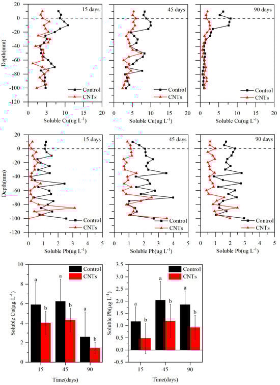 Vertical distribution of soluble Cu and Pb in sediments of the control and CNTs groups at different sampling times, the same letter between groups indicates a significant difference with the same (same letter indicates no significant difference, different letters indicate significant difference).