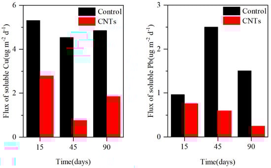 Figure 6 illustrates the fluxes of soluble Cu and Pb. Over the three sampling intervals, the CNTs group consistently exhibited lower release rates compared to the control group. On days 15, 45, and 90, the control group showed soluble Cu release fluxes of 5.31, 4.55, and 4.86 μg m−2 d−1, respectively, whereas the CNTs group exhibited release fluxes of 2.80, 0.76, and 1.85 μg m−2 d−1. Specifically, on days 15, 45, and 90, the control group released 2.51, 3.78, and 3.00 μg m−2 d−1 more soluble Cu than the CNTs group. Similarly, on days 15, 45, and 90, the control group exhibited soluble Pb release fluxes of 0.97, 2.50, and 1.51 μg m−2 d−1, respectively, while the CNTs group released 0.76, 0.59, and 0.25 μg m−2 d−1 of soluble Pb. The corresponding differences in release rates between the control and CNTs groups were 0.21, 1.91, and 1.26 μg m−2 d−1 for soluble Pb on days 15, 45, and 90, respectively.
