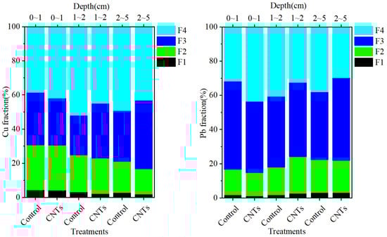 Figure 7 illustrates the variations in the speciation of Cu and Pb within the sediment layers. In the control group, the mean concentrations of Cu in the F1, F2, F3, and F4 fractions within the surface 5 cm sediment layer were 3.45, 22.01, 28.06, and 46.38 mg·kg−1, respectively. In the CNTs group, the mean concentrations of Cu in the F1, F2, F3, and F4 fractions within the surface 5 cm sediment layer were 2.62, 19.46, 31.63, and 41.06 mg·kg−1, respectively. Relative to the control group, CNTs capping reduced the average Cu concentrations in the surface 5 cm sediment layer by 0.68%, 1.52%, and 3.24% for the F1, F2, and F4 fractions, respectively, while increasing the F3 fraction by 5.44%. In the control group, the mean concentrations of Pb in the F1, F2, and F4 fractions within the surface 1 cm sediment layer were 0.57, 5.18, and 34.62 mg·kg−1, respectively. In the surface 1 cm sediment layer of the CNTs group, the mean concentrations of Pb were 0.45, 5.37, and 39.73 mg·kg−1 for the F1, F2, and F4 fractions, respectively. Relative to the control group, CNTs capping reduced the F1 fraction of Pb by 0.53% and increased the F4 fraction of Pb by 11.62% in the surface 1 cm sediment layer. Additionally, the F3 fraction of Pb in the surface 5 cm sediment layer increased by 0.37% compared with the control group.