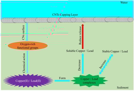 The notable reduction in DO in sediments following the application of gauze-wrapped CNTs suggests that this capping method gradually drives the sediment toward an anoxic environment (Figure 4). Under such conditions, the reduction in Fe(III)/Mn(IV) oxyhydroxides occurs, releasing previously trapped Cu and Pb []. However, the Cu and Pb released during this anoxic process are rapidly adsorbed by the CNTs. The considerable decreases in the concentrations and release rates of soluble Cu and Pb in the CNTs group (Figure 5 and Figure 6) provide strong evidence for this process [,]. Furthermore, the mildly alkaline conditions observed in sediments after CNTs application (Figure 4) promote the uptake of both metals by the modified nanotubes []. Under such conditions, the CNTs surface acquires a more negative charge, thereby generating electrostatic forces that enhance their adsorption capacity for Cu and Pb [].