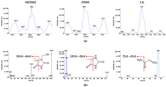 The MRM mass transitions for quantitative analysis were determined by evaluating the sensitivity of protonated ions and product ion spectra. The Q1 and product ion mass spectra of protonated MDMH, DMH, and internal standard are shown in Figure 2. The most abundant ions in the full scan Q1 mass spectrum were the protonated molecular ions of MDMH, DMH, and acrylamide (internal standard), observed at m/z 159.0, 129.0, and 72.0, respectively. In the product ion scan mass spectra, the most prominent product ions were observed at m/z 84.0 for MDMH, 58.0 for DMH, and 55.0 for acrylamide. Subsequently, the MRM transitions were set at 159.0 → 84.0 m/z for MDMH, 129.0 → 58.0 m/z for DMH, and 72.0 → 55.0 m/z for acrylamide (IS).