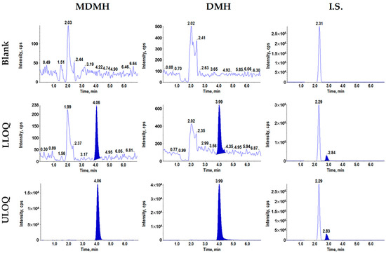 Selectivity was assessed by analyzing blank plasma and blank plasma spiked with MDMH, DMH, and internal standard. Calibration curves were constructed using weighted linear regression (1/x) of the peak area ratios of analytes to internal standard versus nominal concentrations. Correlation coefficients exceeded 0.999 for all analytes. The LLOQ was defined as the lowest calibration standard concentration that demonstrated signal-to-noise ratios ≥10 with acceptable accuracy and precision (≤20%).