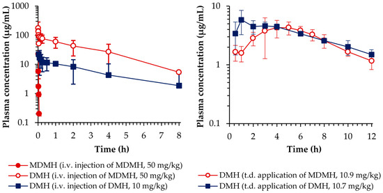 Average plasma concentration-time profiles of MDMH and DMH obtained after IV injection of MDMH at a dose of 50 mg/kg, DMH at a dose of 10 mg/kg, TD application of MDMH at a dose of 10.9 mg/kg, and DMH at a dose of 10.7 mg/kg in rats (n = 5, each).