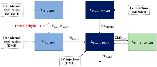 For transdermal application, MDMH applied to the skin undergoes simultaneous absorption and metabolic conversion to DMH and formaldehyde. This process was described by a first-order rate constant (ka,met) representing the combined absorption-metabolism kinetics. The parameter Fa,met represents the fraction of applied dose that penetrates the skin and undergoes metabolic conversion, accounting for incomplete absorption.