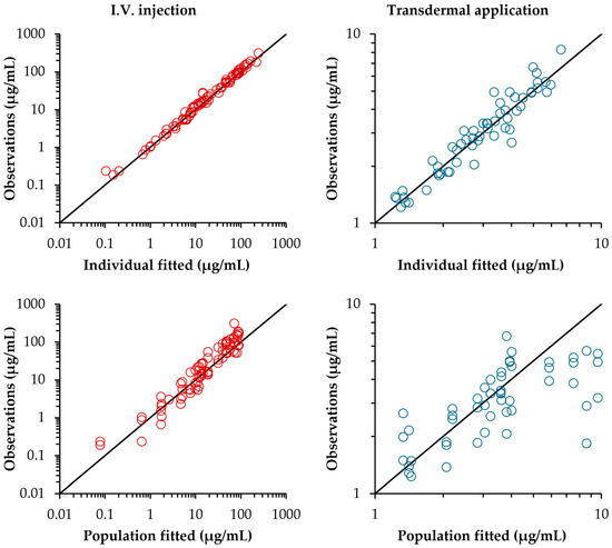 Goodness-of-fit plots for the final population toxicokinetic model showing individual predictions (IPRED, upper panels) and population predictions (PRED, lower panels) versus observed concentrations (DV) following IV injection (left) and TD application (right). Solid lines represent the line of identity (slope = 1).