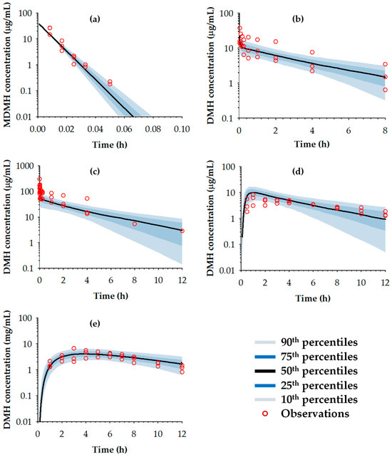 Visual predictive check plots for validation of the final model. (a) MDMH concentration following IV injection of MDMH, (b) DMH concentration following IV injection of MDMH. (c) DMH concentration following IV injection of DMH, (d) DMH concentration following TD application of MDMH and (e) DMH concentration following TD application of DMH. The lines represented predicted percentiles (10th, 25th, 50th, 75th, 90th) and circles representing the observation.