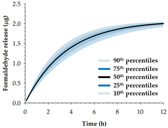 The population toxicokinetic model predicted formaldehyde formation based on the 1:1 stoichiometric conversion of MDMH to DMH and formaldehyde via hydrolytic cleavage. Following transdermal application of 2% MDMH gel (10.9 mg/kg), cumulative formaldehyde formation reached 85% of the theoretical maximum within 8 h, corresponding to degradation of MDMH in the skin (Figure 8).