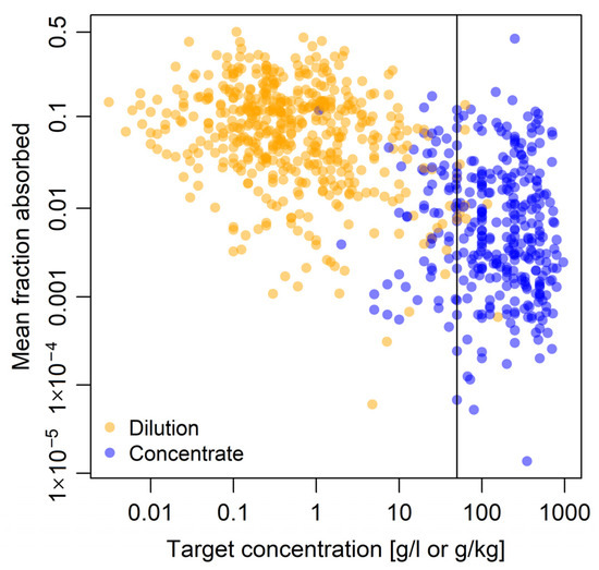 Relationship of target concentration and mean fraction absorbed. Mean fraction absorbed is the mean across replicates for dilutions and concentrates aggregated by substance and study. The x-axis is log-transformed (base 10) and the y-axis is logit-transformed. Concentrates represent the undiluted product; dilutions are intended in-use dilutions of a product. The vertical line shows the alternative classification of target concentrations into concentrates and dilutions using a cut-off at 50 g/L (g/kg) according to SCoPAFF [15].
