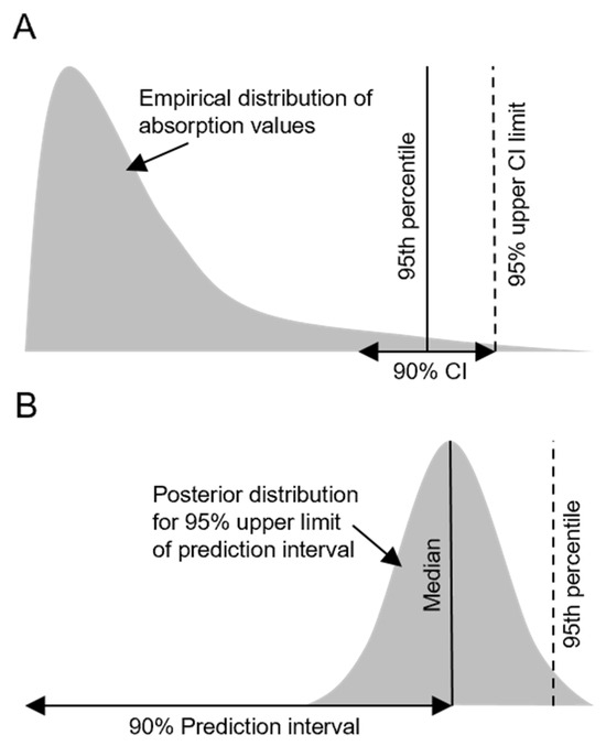 Schematic representation of how default values for dermal absorption were obtained in EFSA GD2017 [9] and this manuscript (A) with the empirical approach and (B) via Bayesian linear mixed modelling. 95th percentile: 95% of (empirical) values are lower than this value. 95% upper limit of prediction interval: 95% of future values are predicted to be lower than this value. Dashed lines represent the most conservative option for deriving default values. CI: Confidence interval.