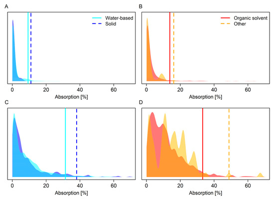 Density plots for empirical distributions of percent active substance absorbed by formulation type category and concentration status obtained in this study. (A,B) Concentrate. (C,D) Dilution. Formulation type categories are plotted in pairs to reduce overplotting. Vertical lines show upper 95% confidence limits for the 95th percentiles of the distributions. Concentrates represent the undiluted product; dilutions are intended in-use dilutions of a product. The y-axis shows the probability density.