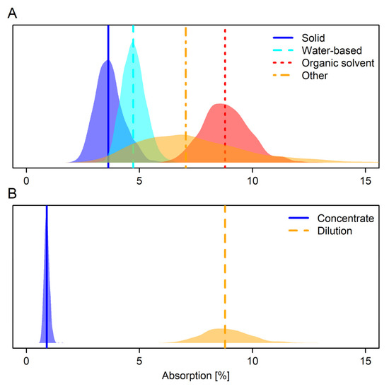 Density plot of model-derived full posterior predictions of mean dermal absorption for (A) formulation type category and (B) concentration status obtained in this study. Vertical lines show median predictions. Predictions were made for the corresponding other categorical predictor’s reference category (dilution, organic solvent). Concentrates represent the undiluted product; dilutions are intended in-use dilutions of a product. The y-axis shows the probability density.