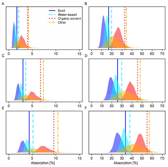 Posterior model predictions indicated that there were differences in absorption among formulation type categories as well as concentrates and dilutions. Predictions were made keeping the corresponding other categorical predictor at its reference category (dilution, organic solvent). On average, active substances in solid formulations showed the lowest absorption (Median % (95% HPDI): 3.6 (2.5–4.9); Figure 4, Table 4), followed by water-based formulations (Median % (95% HPDI): 4.7 (3.8–5.8); Figure 4, Table 4). Active substances in organic solvents were most easily absorbed, and almost complete non-overlap in the posterior predictions between this category and solid and water-based formulations indicated high certainty in a difference between these formulation type categories (Median % (95% HPDI): 8.8 (6.7–11.0); Figure 4, Table 4). Substances in the ‘other’ formulation type category showed the third-highest absorption on average, but uncertainty around the median estimate was high and posterior predictions spanned almost the complete width of the posteriors of all other formulation type categories combined (Median % (95% HPDI): 7.1 (3.3–12.4); Figure 4, Table 4).