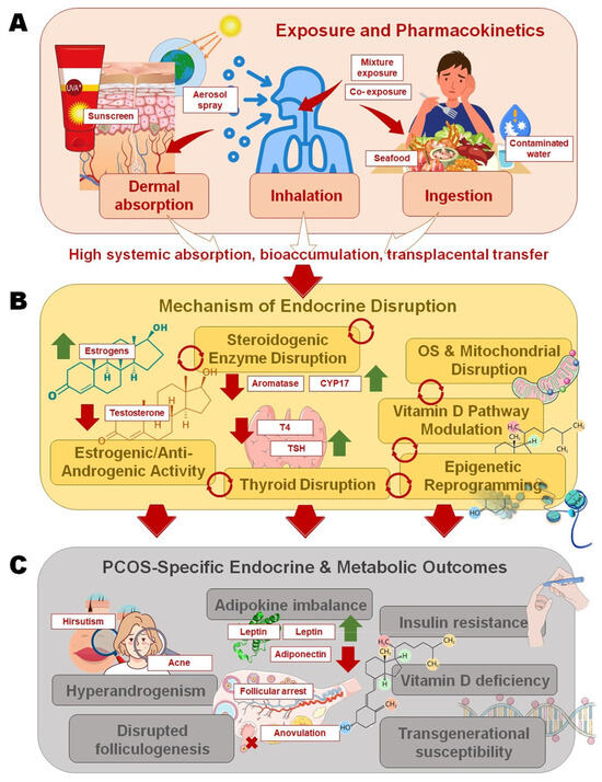Pathways linking sunscreen ultraviolet (UV) filters to polycystic ovary syndrome (PCOS)-specific outcomes: (A) Oxybenzone and octinoxate enter the body through dermal absorption, inhalation of sprays, or ingestion of contaminated seafood and water, with high systemic absorption, bioaccumulation, and transplacental transfer; (B) Mechanistic disruptions include steroidogenic enzyme interference, estrogenic/anti-androgenic receptor activity, thyroid hormone imbalance, oxidative stress with mitochondrial dysfunction, vitamin D pathway modulation, and epigenetic reprogramming; (C) These pathways converge on PCOS pathophysiology, leading to hyperandrogenism, disrupted folliculogenesis and anovulation, adipokine imbalance with insulin resistance (IR), vitamin D deficiency, and potential transgenerational susceptibility.