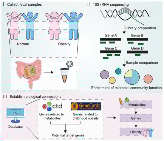 The research design diagram illustrates the three main steps of the study. The first step involves collecting fecal samples from normal weight and obese children. The second step is to perform 16S rRNA sequencing to characterize the differences in microbial composition and functions between the groups, and to predict potentially metabolism-related functional pathways. The third step integrates multiple databases (CTD and GeneCards) to establish biological connections, linking metabolites from the gut microbiome to obesity-related genes, thereby identifying potential molecular targets for childhood obesity.