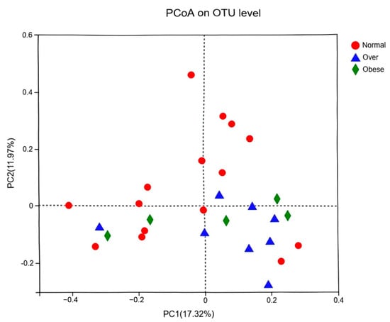 Principal coordinates analysis (PCoA) of gut microbiota at the OTU level among children with different BMI statuses. Note: Normal, normal-weight group; Over, overweight group; Obese, obese group.