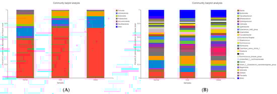 Genomic DNA was extracted from fecal samples using the E.Z.N.A.® Soil DNA Kit (Omega Bio-tek, Norcross, GA, USA) following the manufacturer’s protocol. DNA quality was verified by 1% agarose gel electrophoresis, and concentration and purity (with A260/A280 ratios between 1.8 and 2.0 considered acceptable) were determined using a NanoDrop2000 spectrophotometer (Thermo Fisher Scientific, Waltham, MA, USA). The V3–V4 region of the bacterial 16S rRNA gene was amplified with primers 338F (5′-ACTCCTACGGGAGGCAGCAG-3′) and 806R (5′-GGACTACHVGGGTWTCTAAT-3′). PCR amplification was performed on an ABI GeneAmp® 9700 thermal cycler(Thermo Fisher Scientific, Waltham, MA, USA)under the following conditions: 95 °C for 3 min; 27 cycles of 95 °C for 30 s, 55 °C for 30 s, and 72 °C for 45 s; and a final extension at 72 °C for 10 min. PCR products were stored at 4 °C for further analysis.