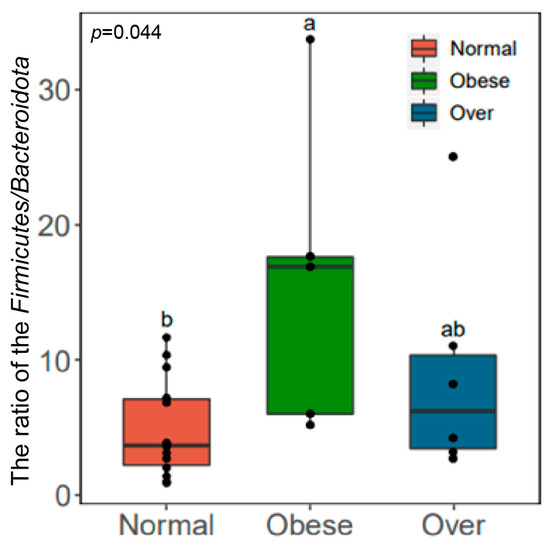 Comparison of the Firmicutes/Bacteroidota (F/B) ratio in gut microbiota among children with different BMI statuses. Note: Normal, normal-weight group; Over, overweight group; Obese, obese group; p < 0.05; Obese is labeled as a, Normal is labeled as b, and the difference between the two is significant; Over is labeled as ab and is not significantly different from Obese (a) or Normal (b).