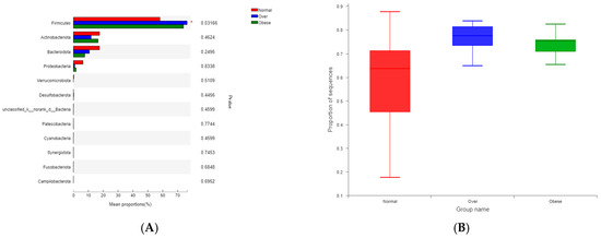 Microbial community composition of gut microbiota in children with different BMI statuses. (A) Composition at the phylum level; (B) Composition at the genus level. Note: Normal, normal-weight group; Over, overweight group; Obese, obese group.