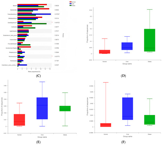 Differential abundance of gut microbial taxa among children with different BMI statuses. (A) Phylum-level abundance comparison; (B) Abundance of Firmicutes; (C) Genus-level abundance comparison; (D) Abundance of Subdoligranulum; (E) Abundance of Ruminococcus; (F) Abundance of Lachnospira. Note: Normal, normal-weight group; Over, overweight group; Obese, obese group. * p < 0.05.