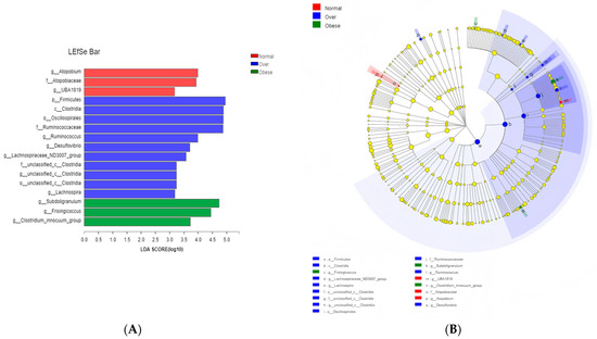 Identification of differentially abundant taxa among the three groups by LEfSe analysis. (A) Histogram of LDA scores; (B) Cladogram showing the phylogenetic distribution of discriminative features. Note: Normal, normal-weight group; Over, overweight group; Obese, obese group.