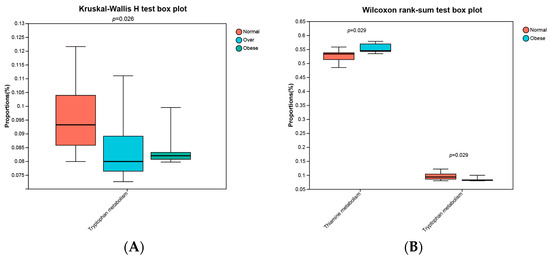 KEGG Level 3 pathway analysis revealed significant alterations in microbial functional predictions. Tryptophan metabolism differed among groups (p = 0.026, Kruskal–Wallis test), with higher levels in the normal-weight group compared to overweight and obese groups (Figure 7A). Pairwise comparisons further showed reduced tryptophan metabolism (p = 0.029) and increased thiamine metabolism (p = 0.029) in the obese group (Figure 7B).