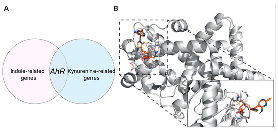 Considering that the decline in tryptophan metabolic pathways leads to a decrease in indole-related metabolites and an increase in kynurenine-related metabolites, we used databases to search for related genes to explore the biological connection between metabolites and childhood obesity [26]. We searched the Comparative Toxicogenomics Database to obtain Indole and Kynurenine related genes using the keywords “Indole” and “Kynurenine”. Genes in the intersection of the CTD database were incorporated into the Indole-related gene set (Indole-set) and the Kynurenine-related gene set (Kynurenine-set). A childhood obesity-related gene set (Childhood obesity-set) was constructed with the genes retrieved from GeneCards with the keyword “Childhood obesity”. Then, the overlapping genes between the indole-set and the childhood obesity-set, as well as the overlapping genes between the kynurenine-set and the childhood obesity-set, were selected (Table 4 and Table 5). We found a common target gene–AhR–in indole and kynurenine (Figure 8A). In obese individuals, the level of indole is reduced, leading to the disruption of its role in enhancing the intestinal barrier and improving metabolic homeostasis after binding with AhR, while the accumulation of kynurenine promotes inflammation, energy imbalance, and fat deposition, ultimately resulting in obesity [27,28]. This suggests that the role of AhR depends on ligands and environment, and that in obesity, pro-inflammatory may be dominant.