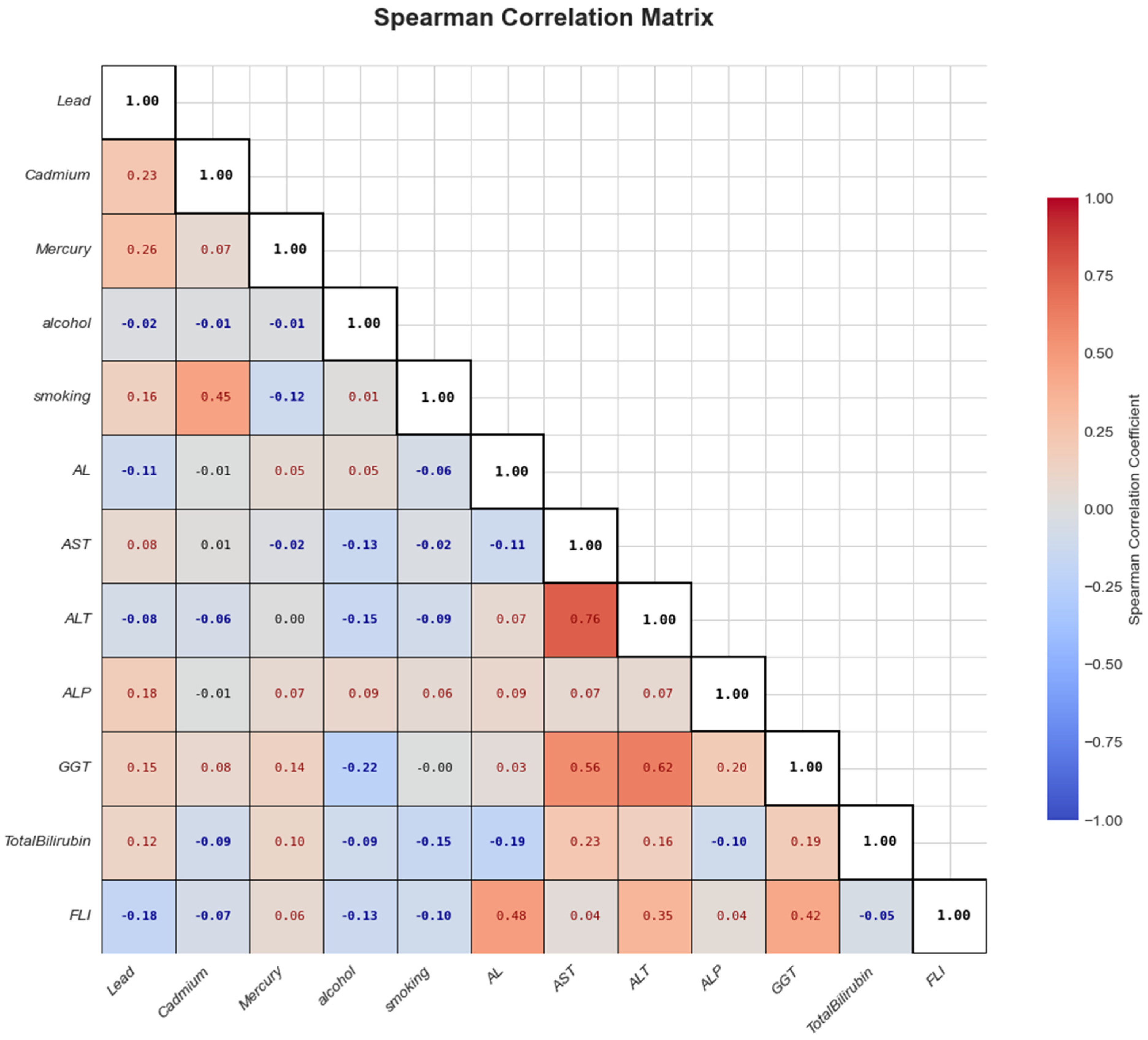 Figure 1 illustrates the Spearman correlation analysis conducted among the key variables, that is, heavy metals, behavioral factors, AL, and liver biomarkers. Stronger correlations are shown with deeper colors—red for positive and blue for negative associations. From the analysis, AL had weak positive correlations with most liver biomarkers.