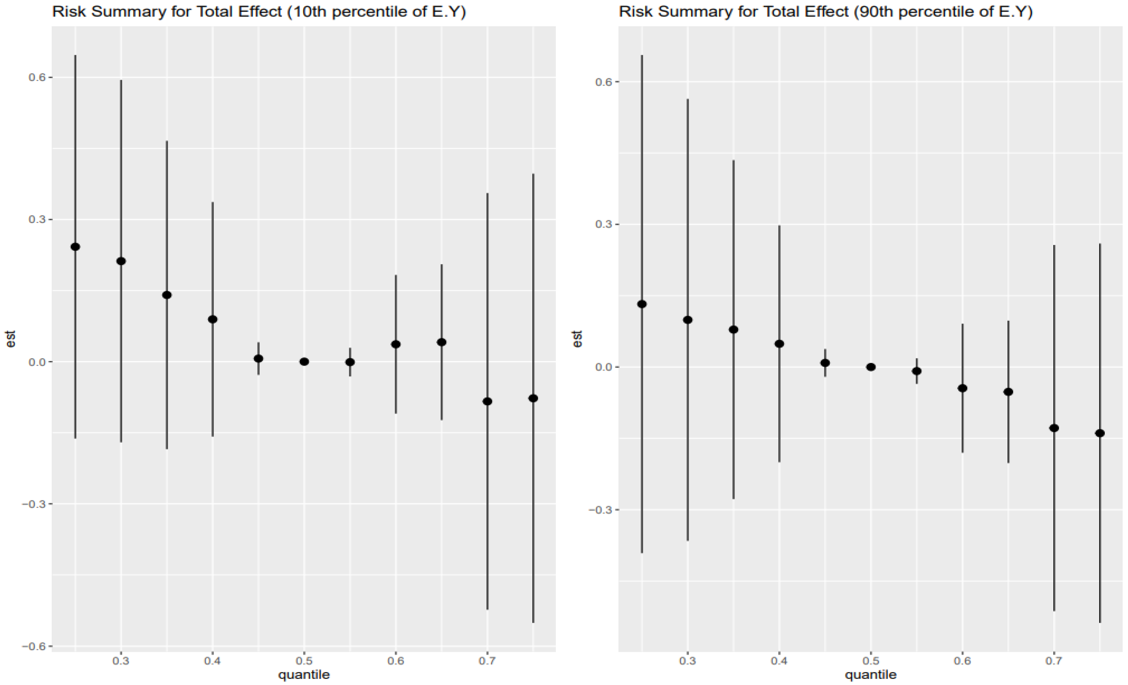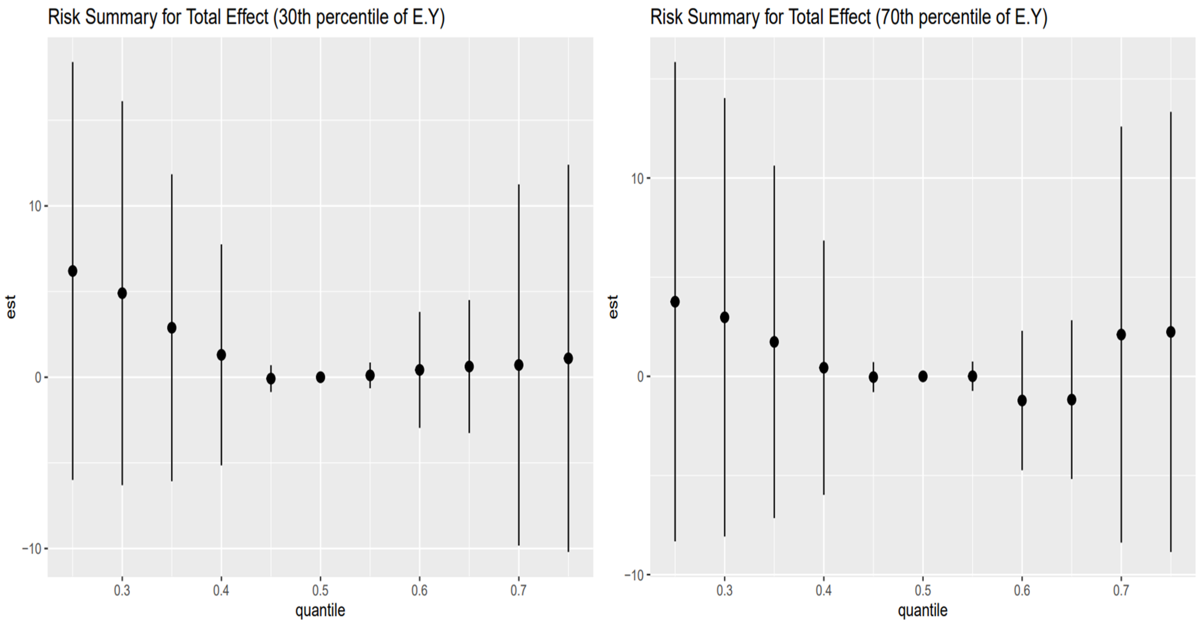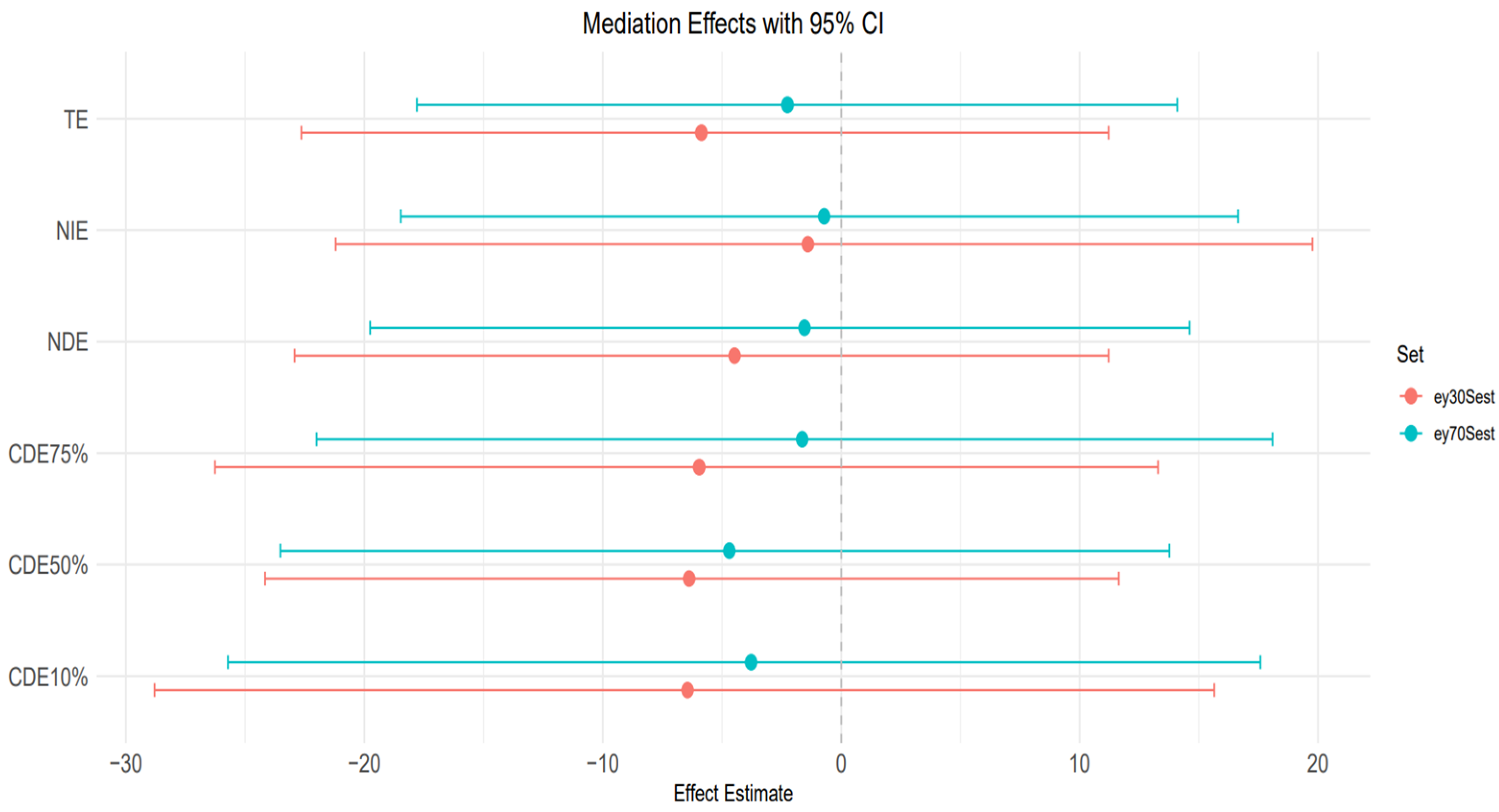 TE (Total effect): The total effects for both age groups (30th and 70th percentiles) taper slightly below zero and become negative. Also, the credible interval is large and crosses zero, suggesting substantial uncertainty.