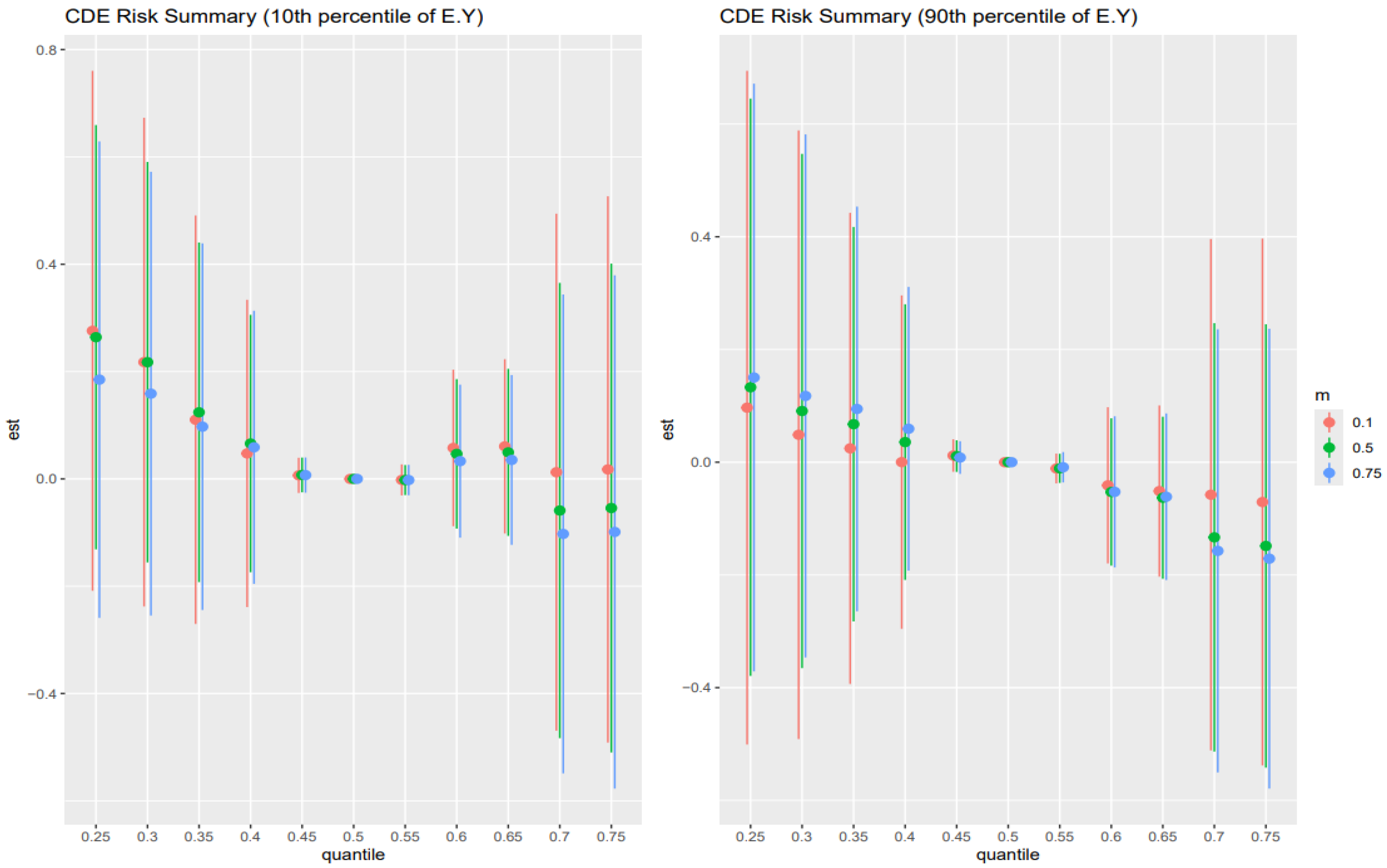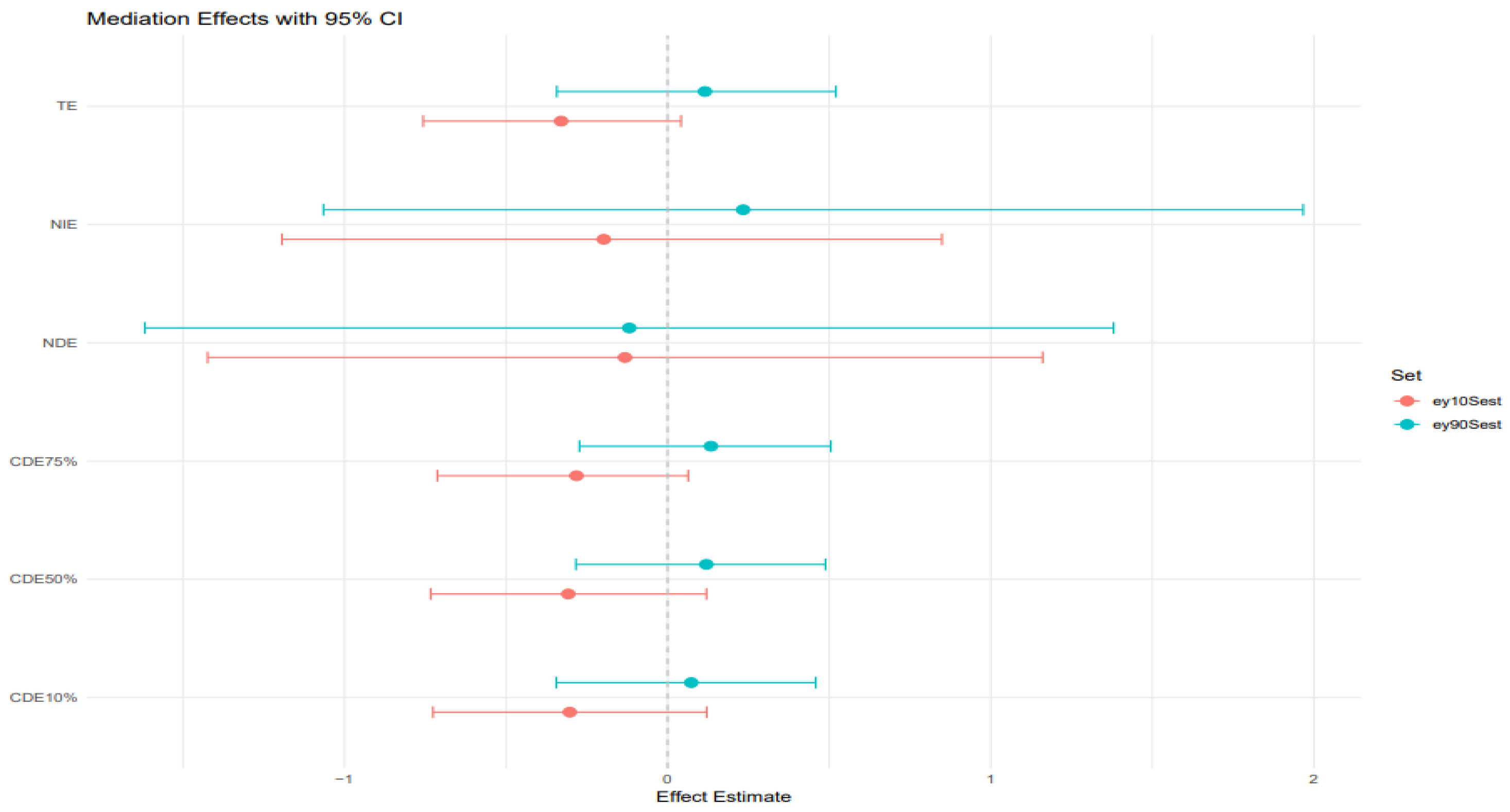 NDE (Natural direct effect): The natural direct effect, independent of AL, is close to zero and negative for both age groups. They both have large credible intervals crossing zero as well. CDEs at different quantiles (10%, 50%, 75%): The controlled direct effects show slightly positive estimates for the younger individuals but negative for the older individuals. The credible intervals for both age groups are narrower but cross zero, indicating that while there may be a weak positive association with AL in the younger individuals, the results remain highly uncertain and should be interpreted cautiously.
