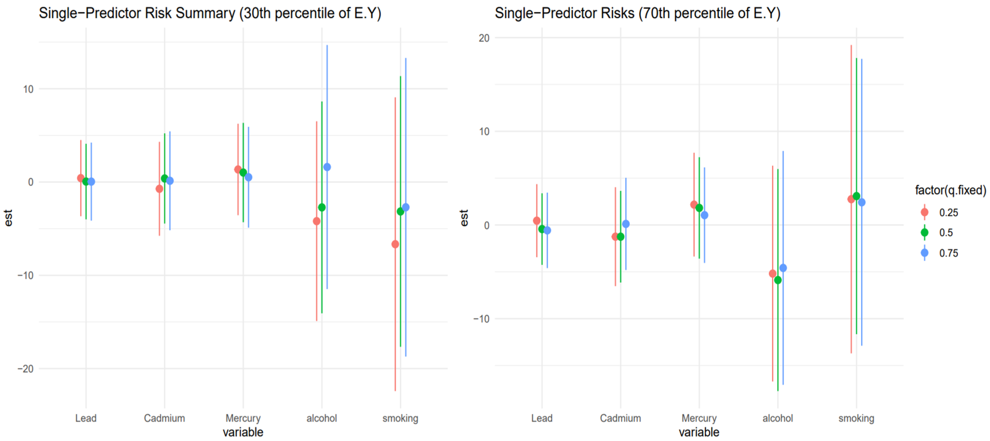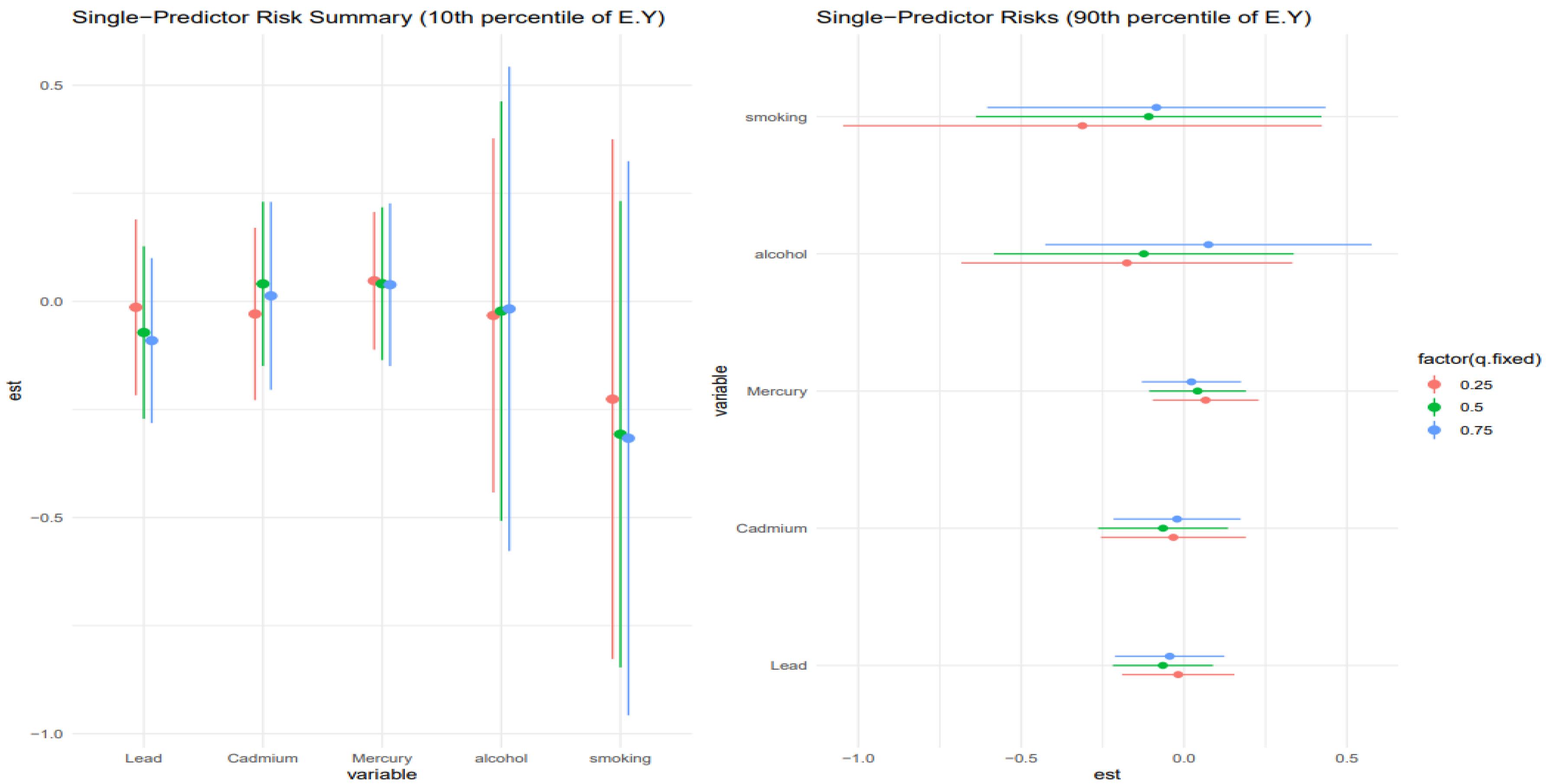 Figure 3, right panel) reveals a more erratic, non-monotonic pattern: the effect fluctuates from slightly positive to negative and back to positive again at the highest quantiles. This volatility, combined with wide credible intervals, may be driven by competing forces at this stage of life, where the body is no longer fully resilient to toxic stress, yet not as fully deteriorated as in the oldest cohort. The inconsistency in direction may also be shaped by differential interaction effects between exposures, AL, and latent comorbidities that tend to accumulate in later life [