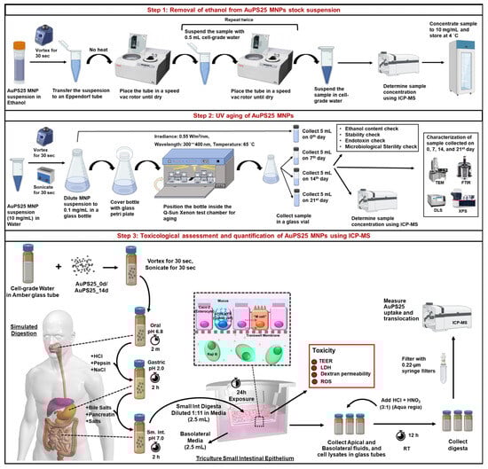 Preparation and characterization of NPs: Briefly, 25 nm sized gold core–polystyrene spheres (referred to as AuPS25), suspended in absolute ethanol, were sourced from CD Bioparticles, NY, USA. After evaporating the ethanol utilizing a SpeedVac Vacuum concentrator, the AuPS25 was resuspended in a food model (water, a fasting food model) using water-bath sonication. The AuPS25 NPs were then UV-aged for 21 days using the Q-Sun Xenon UV aging chamber, Westlake, OH, USA. To evaluate the aging effects over time, physicochemical characterization of the samples was performed on day 0 (un-aged) as well as on the 7th, 14th, and 21st days (aged) of UV exposure using DLS, TEM, FT-IR, and XPS. The ethanol content, endotoxin levels, and microbiological sterility were also assessed on the prepared AuPS25 samples used in toxicity testing to avoid potential confounding sources of toxicity beyond the AuPS25 NPs themselves.