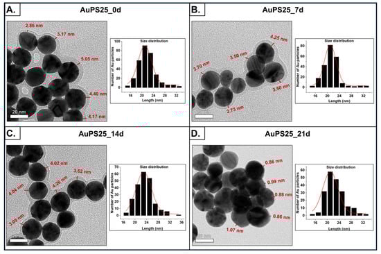 Morphological characterization of un-aged and aged AuPS25 NPs. TEM images and size distribution of (A) un-aged AuPS25 NPs, (B) 7-day-aged AuPS25 NPs, (C) 14-day-aged AuPS25 NPs, and (D) 21-day-aged AuPS25 NPs. The thickness of the PS shells is indicated in red in the TEM images of un-aged and aged AuPS25 NPs.