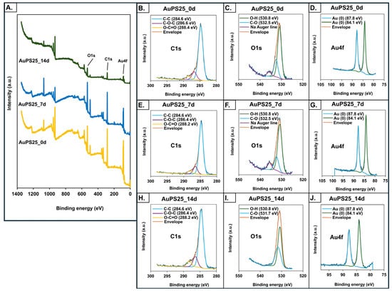 X-ray photoelectron spectroscopy (XPS) analysis of un-aged, 7-day-aged, and 14-day-aged AuPS25 NPs. XPS spectra of (A) un-aged and aged AuPS25 NPs; (B–D) carbon (C), oxygen (O), and gold (Au) spectra of un-aged AuPS25 NPs; (E–G) carbon (C), oxygen (O), and gold (Au) spectra of 7-day-aged AuPS25 NPs; (H–J) carbon (C), oxygen (O), and gold (Au) spectra of 14-day-aged AuPS25 NPs. Green and orange lines were indicating 'envelope' in (B–J).
