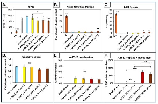 Assessment of toxicity, uptake, and translocation in an in vitro triculture small intestinal epithelium model exposed to SI digesta of un-aged and 14-day-aged AuPS25 in a food model (water). (A) TEER after 24 h exposure; (B) fold change in apparent permeability coefficient (Papp) assessed with fluorescent-labeled 3 KDa dextran; (C) percent cytotoxicity (percent of LDH release relative to that of lysed control cells) after 24 h exposure; (D) reactive oxygen species (ROS, H2O2 equivalent concentrations) in apical fluid; (E) AuPS25 translocation through the intestinal epithelium; (F) AuPS25 uptake (+ mucus fraction of cell lysate) by intestinal epithelium. ns = non-significant; * = p < 0.05, ** p < 0.01 **** p < 0.001. Untreated cells that were exposed to 2X RIPA buffer to induce cell lysis were designated as the positive control (PC).