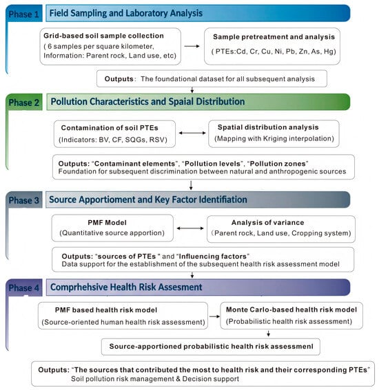 The primary objectives of the present research are as follows: (1) to investigate the concentrations of eight PTEs in soil and compare these values with regional background levels; (2) to analyze the sources of PTEs, utilizing spatial analysis and the positive matrix factorization (PMF) model; (3) to further identify the key influencing factors of specific PTEs by examining parent rock types, land use patterns, and cropping systems; and (4) to conduct a quantitative health risk assessment based on source attribution and probability analysis. A schematic overview of this research framework is provided in Figure 1. The findings of this study aim to provide both theoretical and practical insights for the prevention and management of PTE pollution in regions characterized by high geological background levels.