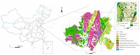 The study area is situated in the hilly regions in central and southern Shandong Province, with geographic coordinates ranging from 118°11′ to 119°06′ east longitude and 35°36′ to 36°13′ north latitude. The topography is predominantly hilly, with an average elevation of 235 m above sea level. The region exhibits a temperate monsoon climate, with an average annual temperature of 14.2 °C and average annual precipitation of 682 mm. The study area is characterized by northeast-trending geological faults with well-developed magmatite formations. Neoarchean granite and diorite are prevalent in the central region of the study area. In the western and northeastern parts, carbonate formations from the Cambrian and Ordovician periods are exposed. Pyroclastic rock formations from the Cretaceous period were found in the eastern and central regions, while Neogene basalt was distributed in the northern parts of the study area. The primary industries in this region include food processing, chemical production, equipment manufacturing, textiles, and mining. This area is also a significant grain-producing region, primarily cultivating wheat and maize.