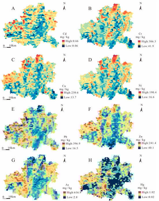 Spatial distribution of concentrations of Cd (A), Cr (B), Cu (C), Ni (D), Pb (E), Zn (F), As (G), and Hg (H).