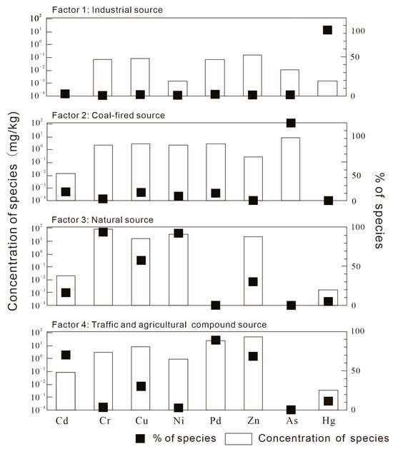 Factor 2 (17.32% of the total contributions) had strong positive loading on As (98.54%). As is a ubiquitous, highly toxic, and volatile trace element in coal. It can be released into the environment during coal mining, storage, and combustion, causing pollution. In the study area, discrete areas of high arsenic concentration are located in the northern part. Their spatial distribution coincides with the locations of coal storage yards and coal-fired power plants. The investigation found that there was a history of small-scale coal mining in Shagou town in the northern part of the study area. An exceptionally high As concentration of 1880.2 mg/kg was found in the surface soil around the coal preparation plant in Yangzhuang town in the north of the study area. The atmospheric subsidence around coal-fired power plants was the primary source of the enrichment of As in soil [,]. Therefore, factor 2 could be regarded as a coal-fired source.