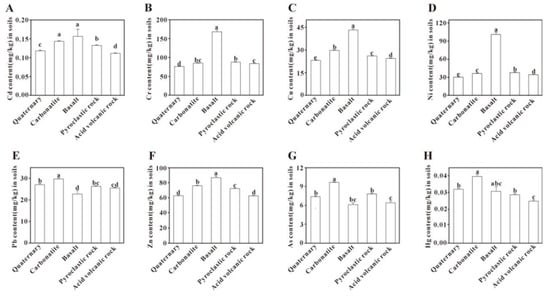Comparison of potentially toxic element content in soils derived from different parent rocks. Bars labeled with different lowercase letters are significantly different from each other (p < 0.05, Tukey’s HSD test).