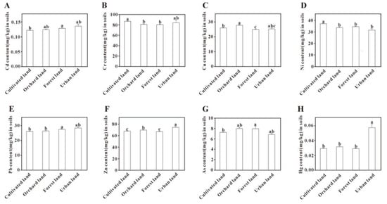 Comparison of potentially toxic element content in soils under different land uses. Bars labeled with different lowercase letters are significantly different from each other (p < 0.05, Tukey’s HSD test).