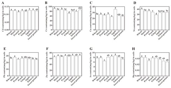 Comparison of potentially toxic element content in soils under different cropping systems. Bars labeled with different lowercase letters are significantly different from each other (p < 0.05, Tukey’s HSD test).
