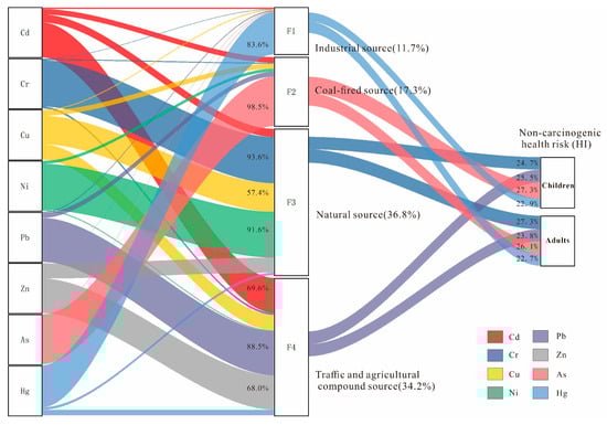 The contribution of each PMF-identified source to the non-carcinogenic health risk was quantified in Figure 8. The ranking of these contributions differed between populations. For children, the order was coal-fired source (27.3%) > traffic and agricultural source (25.5%) > natural source (24.7%) > industrial source (22.9%). In contrast, for adults, the natural source (27.3%) was the dominant contributor, followed by the coal-fired (26.1%), traffic and agricultural (23.8%), and industrial (22.7%) sources. The contributions of the four sources to non-carcinogenic risk were broadly similar. However, the coal-fired source was the dominant contributor for children, while the natural source was the primary contributor for adults. This pattern aligns with the established principle that health risk is more closely associated with the toxicity of PTEs than their total concentration. For instance, natural sources accounted for the largest mass contribution (36.8%) but a lower share of the risk in children (24.7%), which is attributable to the lower toxicity of the associated metals (Cr, Ni, Cu). Conversely, coal combustion sources, representing only 17.3% of the total mass, contributed the highest proportion to children’s health risk (27.3%), due to the high toxicity of arsenic (As). Consequently, pollution control measures should prioritize industries related to coal combustion. This finding is consistent with studies in karst high-geological-background areas in China, where arsenic, despite not being the most abundant contaminant, was identified as the largest contributor to health risks [].